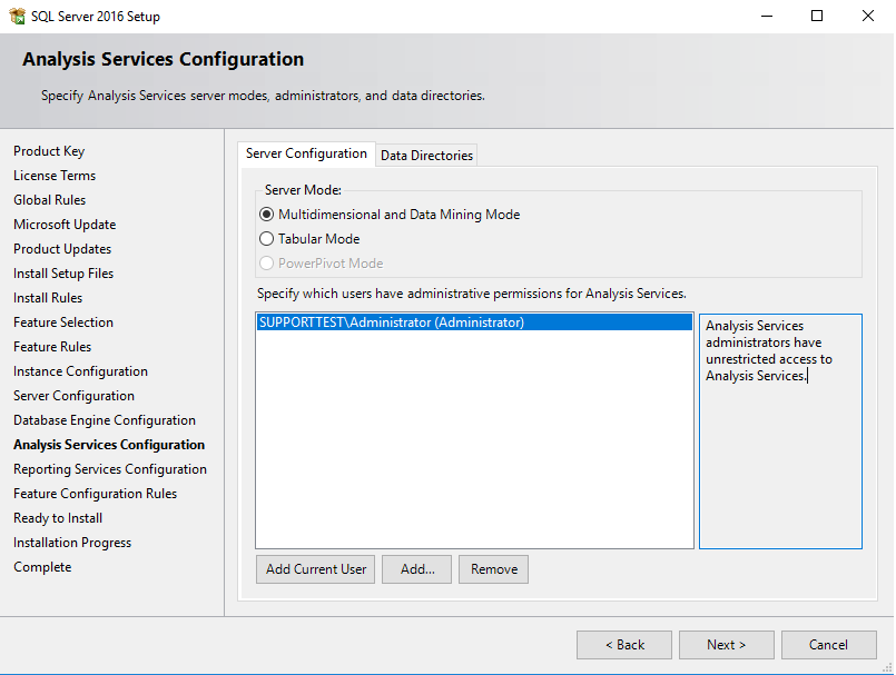 The step 'Analysis Services Configuration' provides three installation options. We select 'Multidimensional and Data Mining Mode' for this installation. In short the differences are: