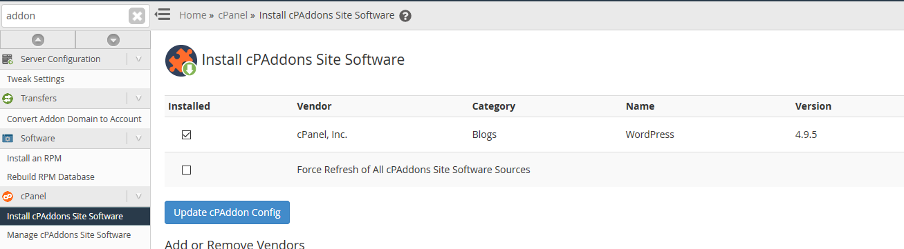 Log in to WHM and find 'AddOn' at the top left of the search field and click 'Install cPAddOns Site Sofware'. On the page that appears, select the WordPress add-on as shown in the screenshot below and click 'Update cPaddon Config'.